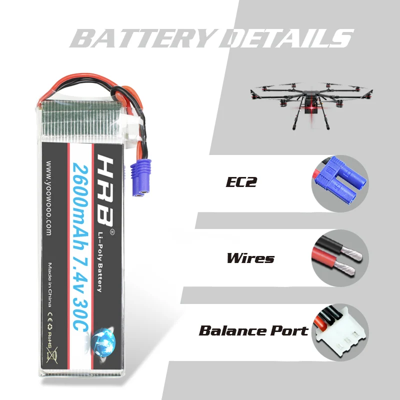 Best HRB Lipo 2s battery Hubsan H501S Battery 7.4V 2600mah 30C EC2 RC Drone Akku Li-Polymer For RC Quadc
